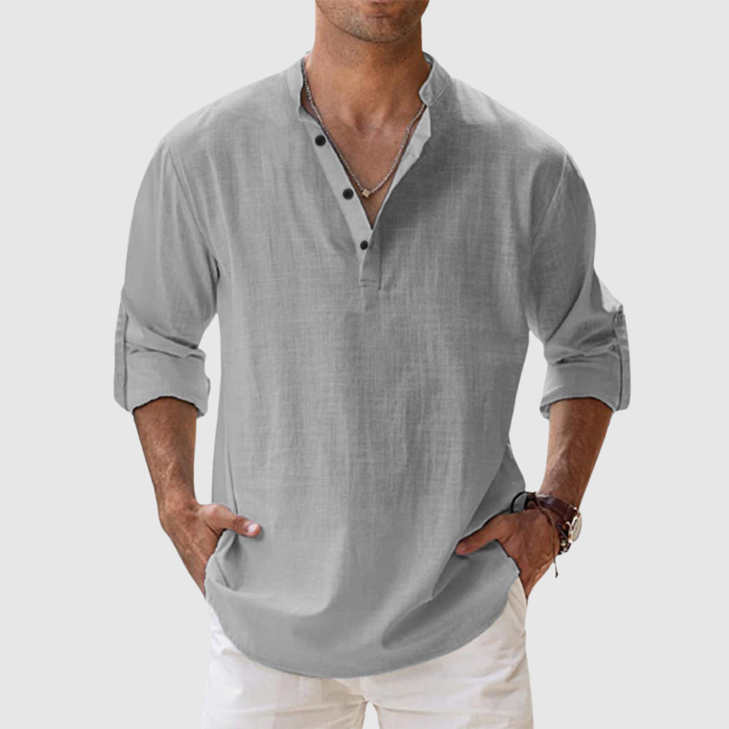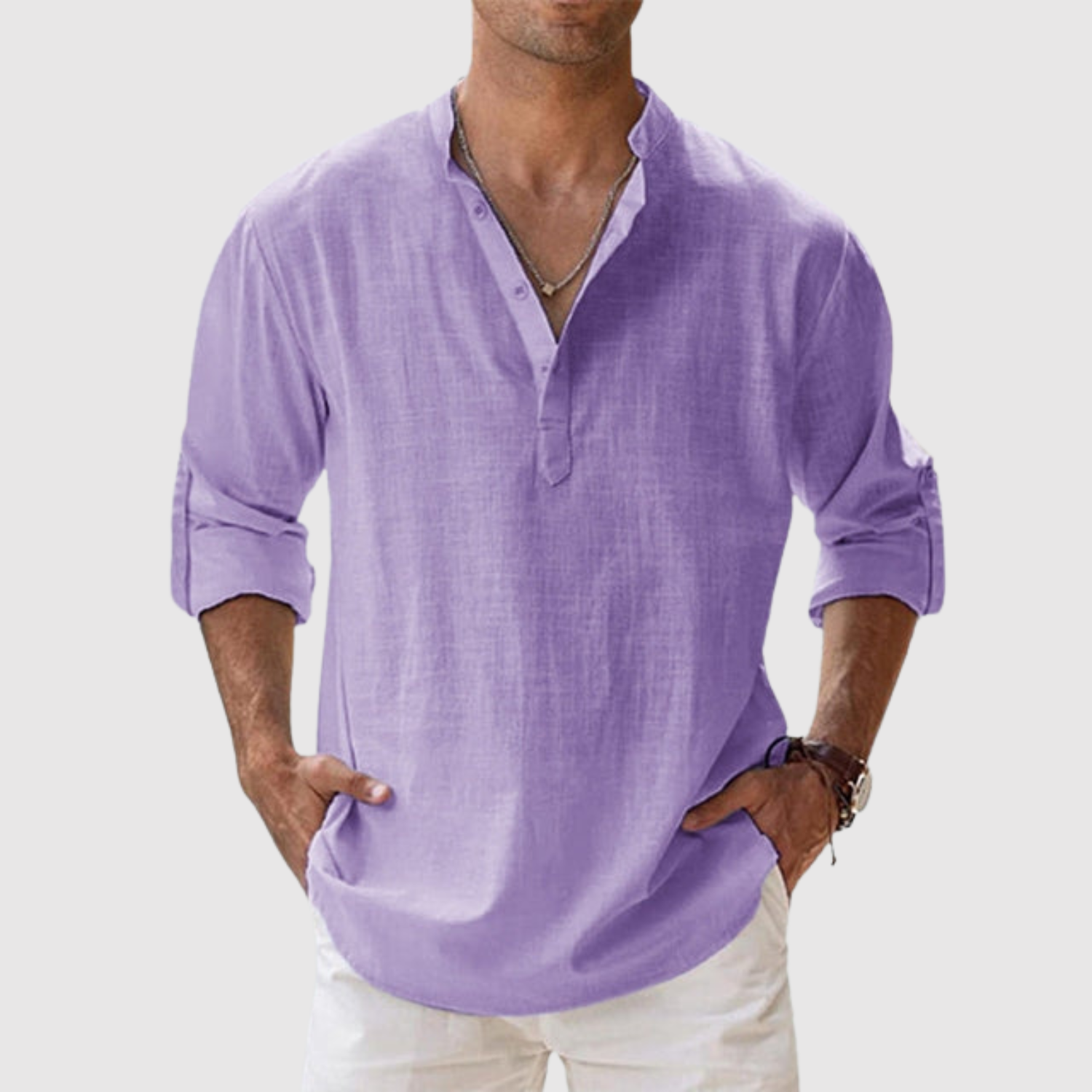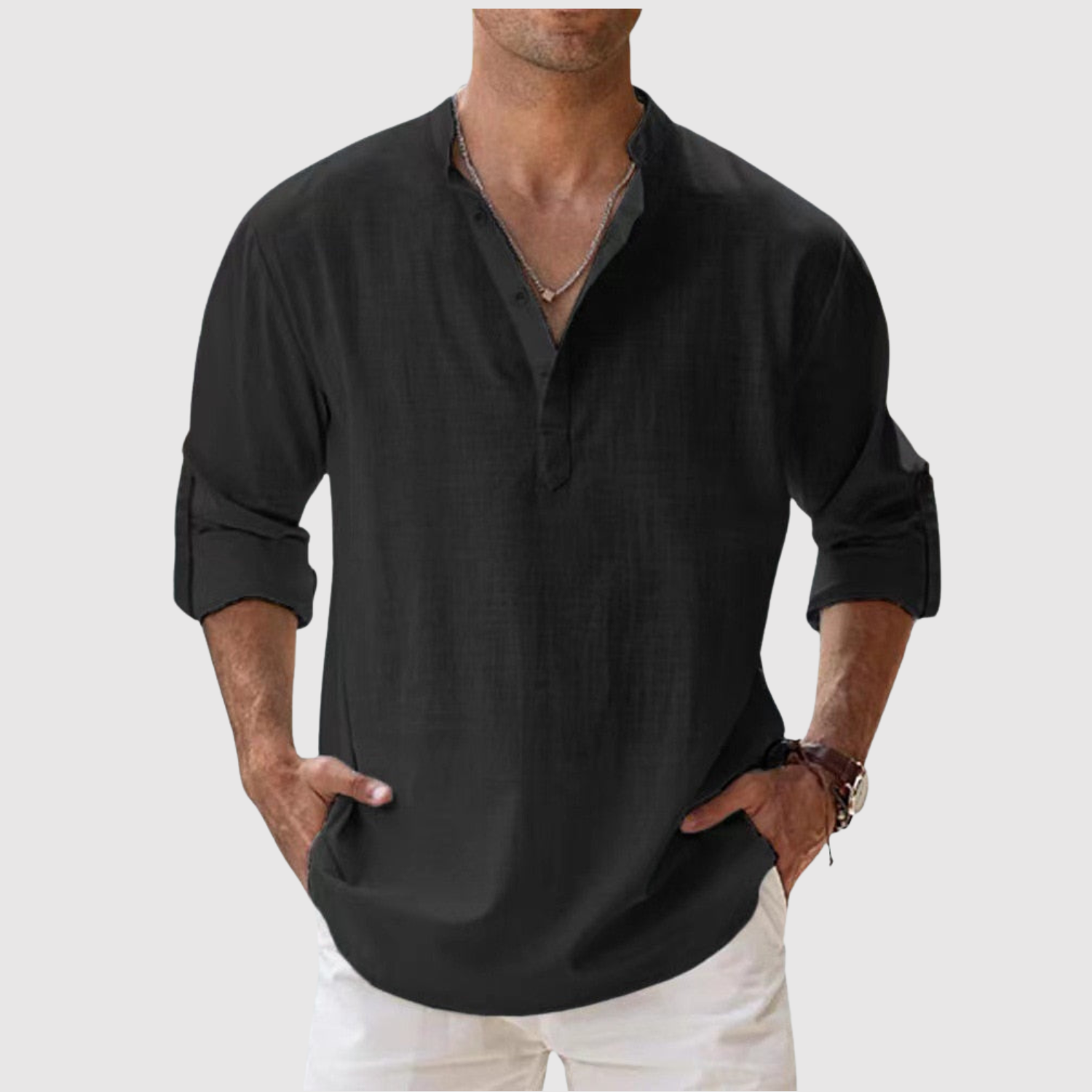 Naša lanena košulja dizajnirana je za muškarce koji žele svjež, moderan izgled bez žrtvovanja udobnosti. Zahvaljujući ležernom kroju i svestranom dizajnu, idealna je i za šetnje plažom i za ležerni urbani stil. Lagan i prozračan materijal pruža udobnost tijekom cijelog dana, dok otvoreni dizajn leđa i duge, podvrnute rukave čine majicu praktičnom i bezvremenskom.